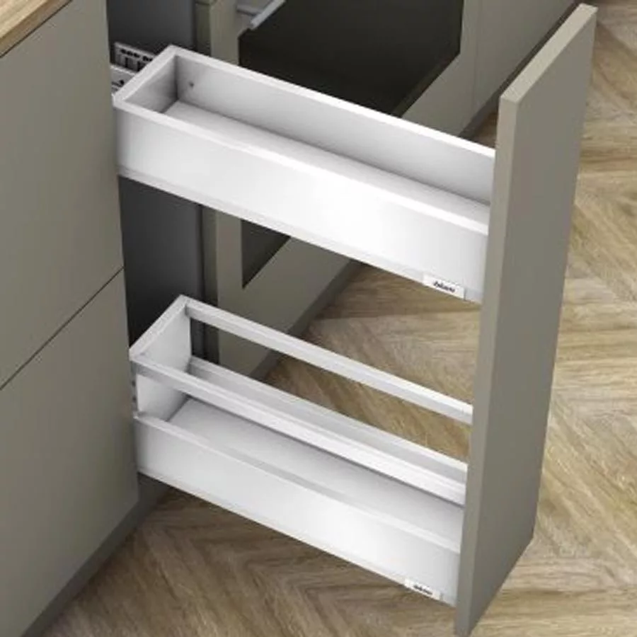 A Blum Space Twin MERIVOBOX TBM fiókszett E-500 korlát magasítással + M-500 fiók az alábbi termékeket tartalmazza: