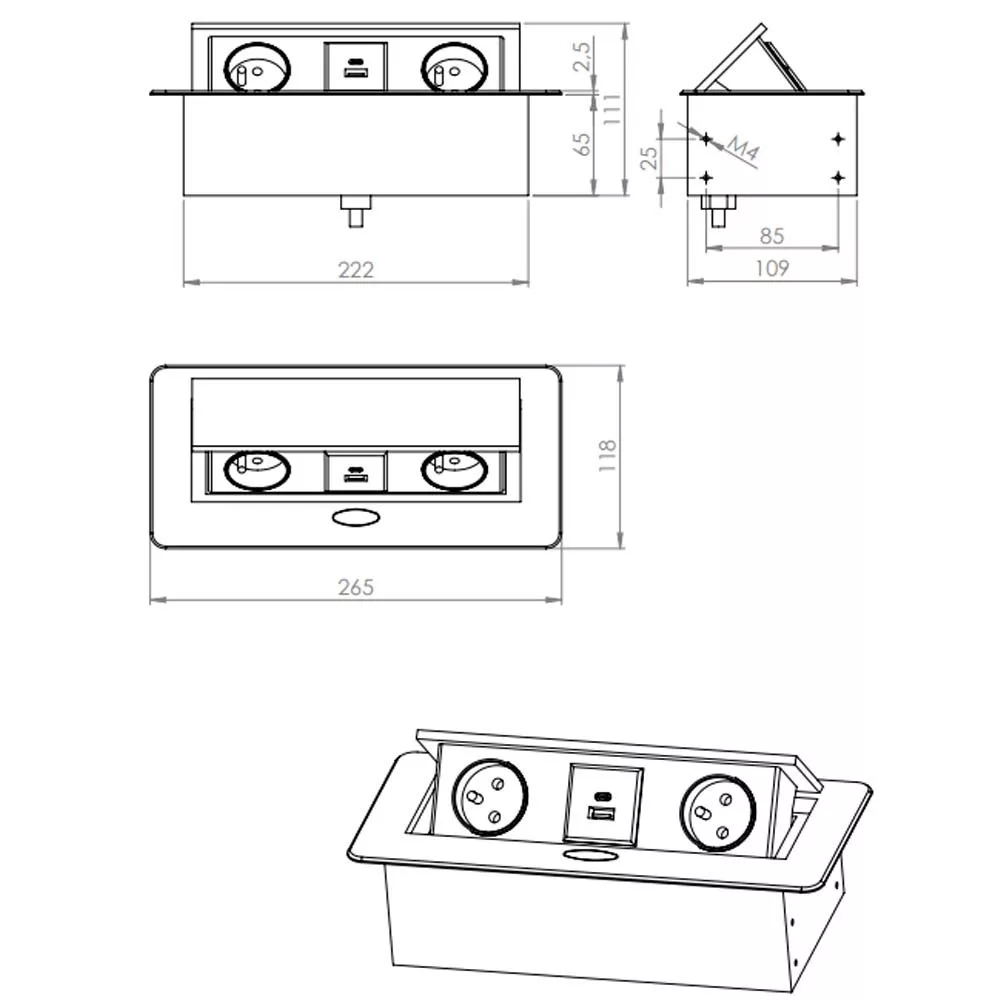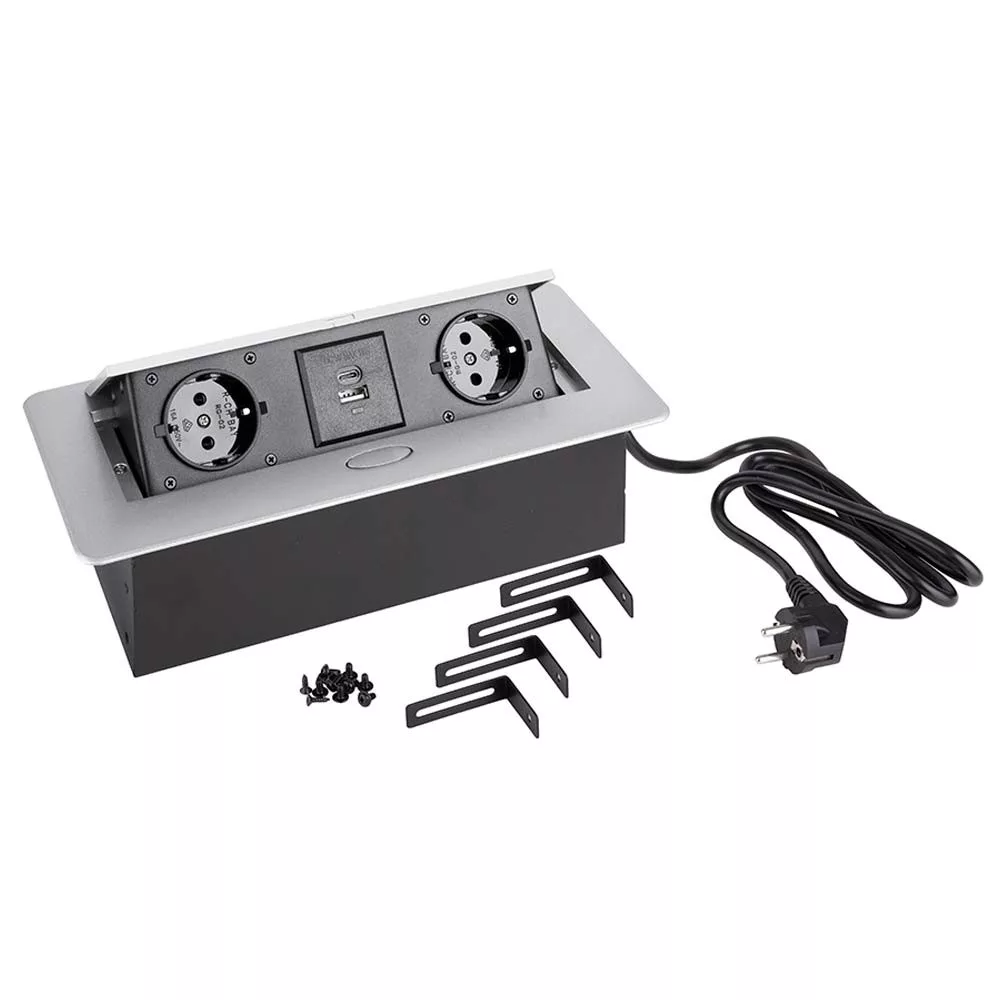 STRONG elektromos aljzat 2x 230V,2x USB A/C, Schuko típusú (általános használat: DE, AT, HU, stb.), 1,5m tápkábel, méretek: 265x118x68mm, ezüst