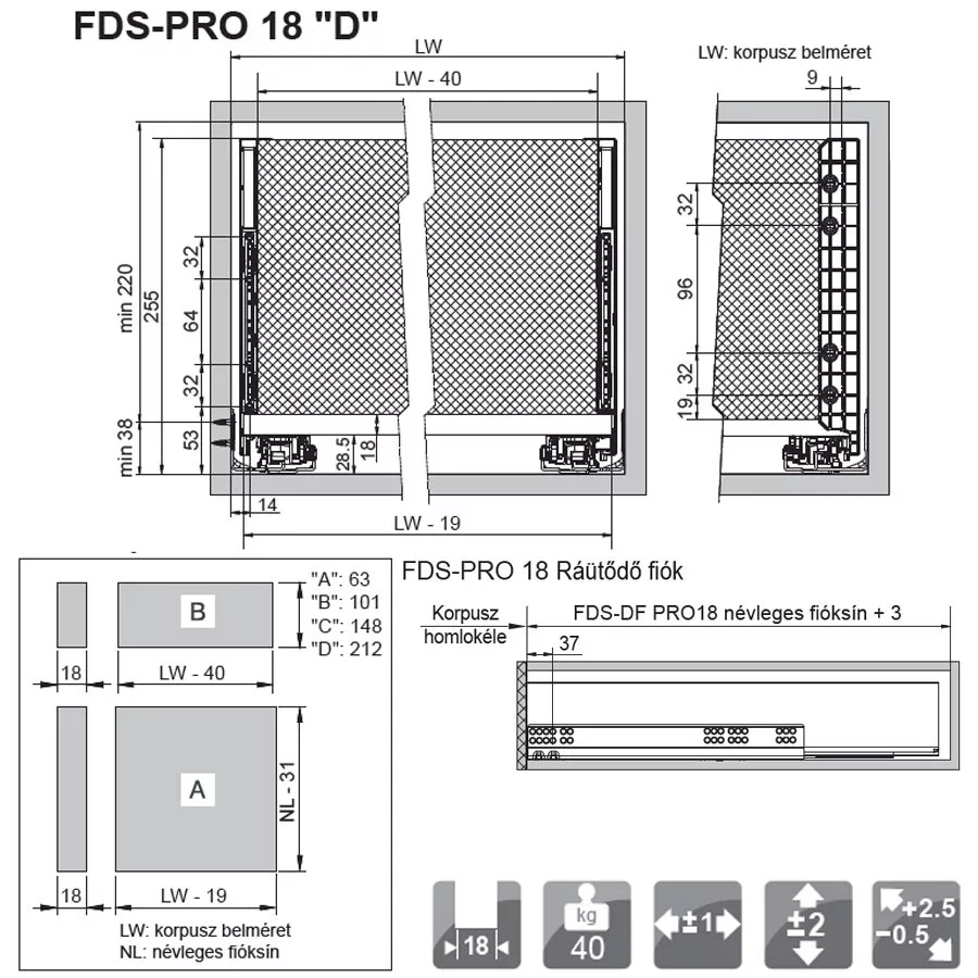 Fiókcsúszó FDS-PRO 18 HD D duplafalú fiókoldal 550mm Antracit 60kg Fém